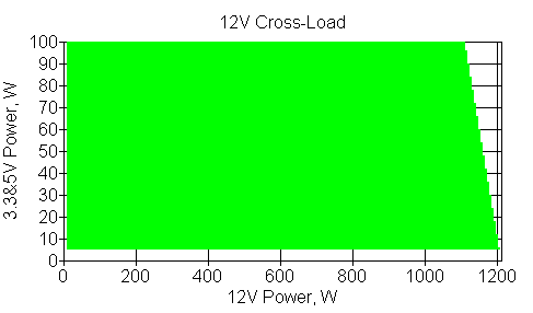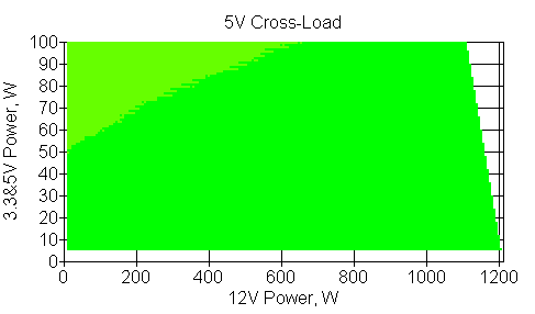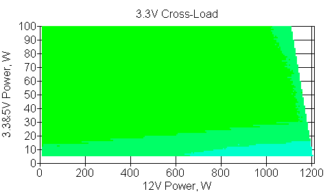 Следующим этапом инструментального тестирования является построение кросснагрузочной характеристики (КНХ) и представление ее на четвертьплоскости, ограниченной максимальной мощностью по шине 3,3&5 В с одной стороны (по оси ординат) и максимальной мощностью по шине 12 В с другой (по оси абсцисс). В каждой точке измеренное значение напряжения обозначается цветовым маркером в зависимости от отклонения от номинального значения.