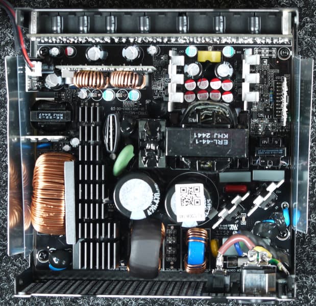 Конструкция блока питания вполне соответствует современным тенденциям: активный корректор коэффициента мощности, синхронный выпрямитель для канала +12VDC, независимые импульсные преобразователи постоянного тока для линий +3.3VDC и +5VDC.