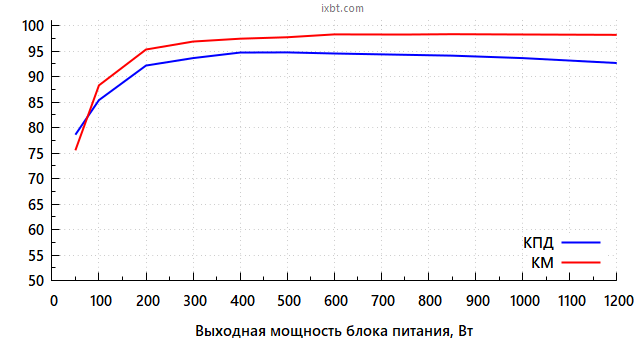 Всего таким образом мы измерили параметры блока питания в 11 точках. В результате максимальный КПД в нашем случае составил 94,8% при выходной мощности 500 Вт, а КПД выше 90% достигается начиная с нагрузки в районе 150 Вт. Максимальная рассеиваемая мощность составила 95 Вт при работе на нагрузку 1200 Вт, что является отличным показателем для блока питания подобной мощности.