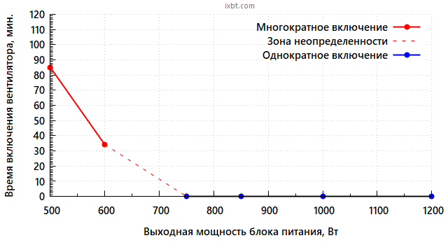 Мы измерили время до включения вентилятора, используя в качестве стартовой точки температуру 30 градусов внутри блока питания. Данное значение температуры можно считать соответствующим работе блока питания в режиме простоя, для его гарантированного достижения на минимальной мощности используется внешний обдув. В каждой из точек графика блок питания отработал не менее 120 минут.