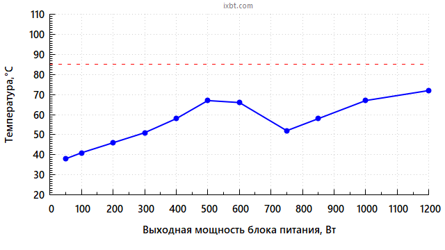 На максимальной мощности температура доходит до 72 градусов, и это не совсем уж здорово, но в реальности вряд ли кто-то будет долговременно эксплуатировать данный БП на максимальной мощности.