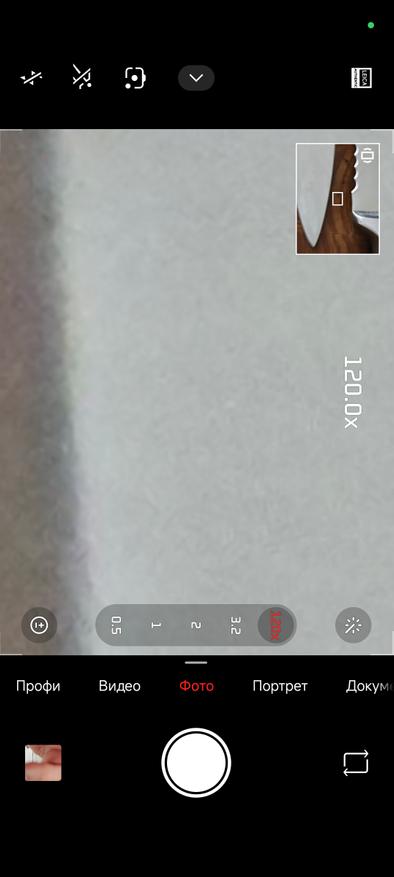 Удержание одной рукой и одновременная съемка — именно этого мне не хватало ранее. Есть и фокусировка по неполному нажатию кнопки спуска затвора. Зумммирование происходит по штатным «вешкам»: 0.5/1/2/3.2/5х, то есть сначала приложение камеры как бы перебирает оптические сенсоры (оптический зум), а затем включается в работу и цифровой зум. С учетом перископического сенсора максимальный зум получается 120х (см. скриншот ниже).
