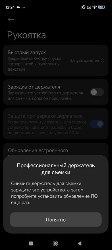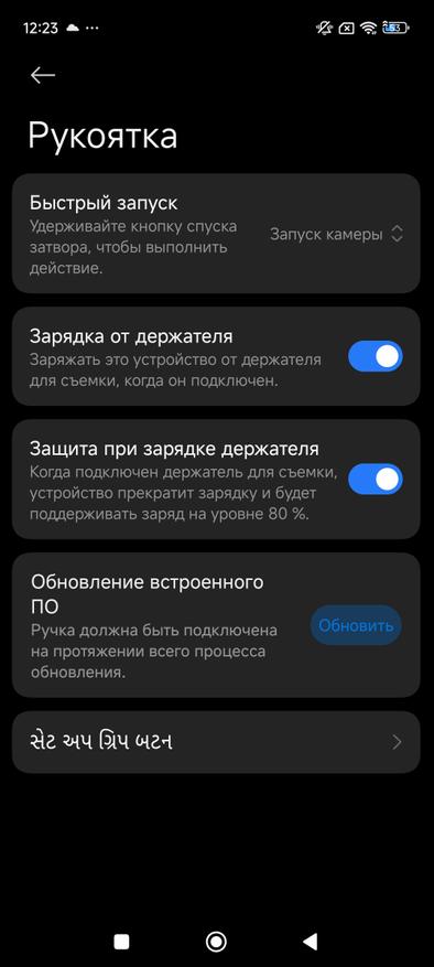 Кит определяется как «Профессиональный держатель для съемки) при подключении батарейной рукоятки через USB-С. В прошивке активируется дополнительный раздел с настройками. Отмечу возможность выбора опций для каждой из кнопок, а также возможность обновить ПО для этого «чехла».