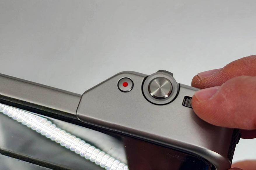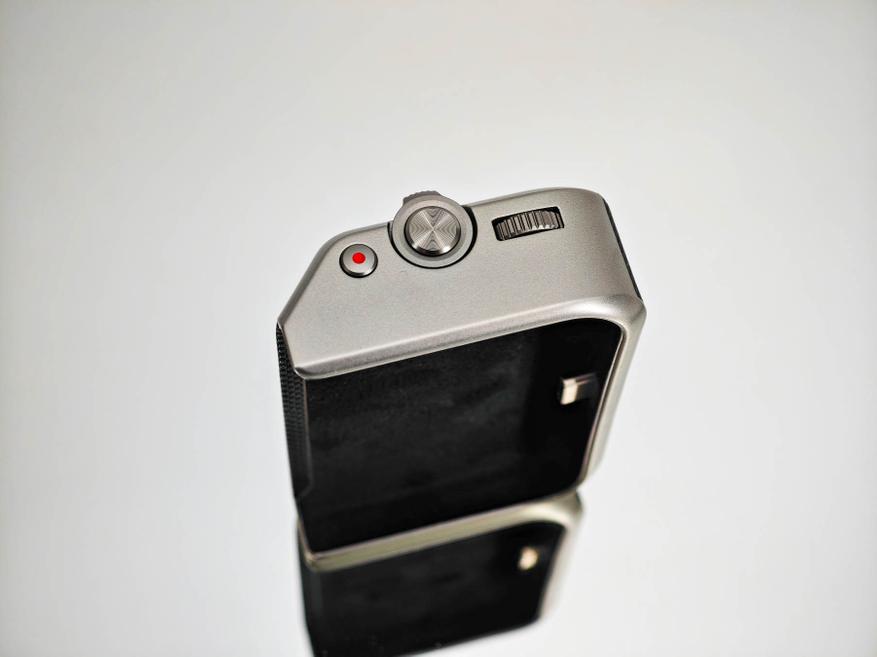 На верхней части алюминиевой панели присутствуют три группы органов управления. Это кнопка съемки видео, комбинированная кнопка спуска затвора с бегунком зуммирования, а также регулятор экспозиции (правое колесо). Все функции настраиваются, но по умолчанию выглядит именно так. Отмечу, что кнопка спуска затвора имеет две позиции срабатывания, как и у настоящей DSLR/беззеркалки. То есть при неполном нажатии происходит процесс фокусировки на объекте.