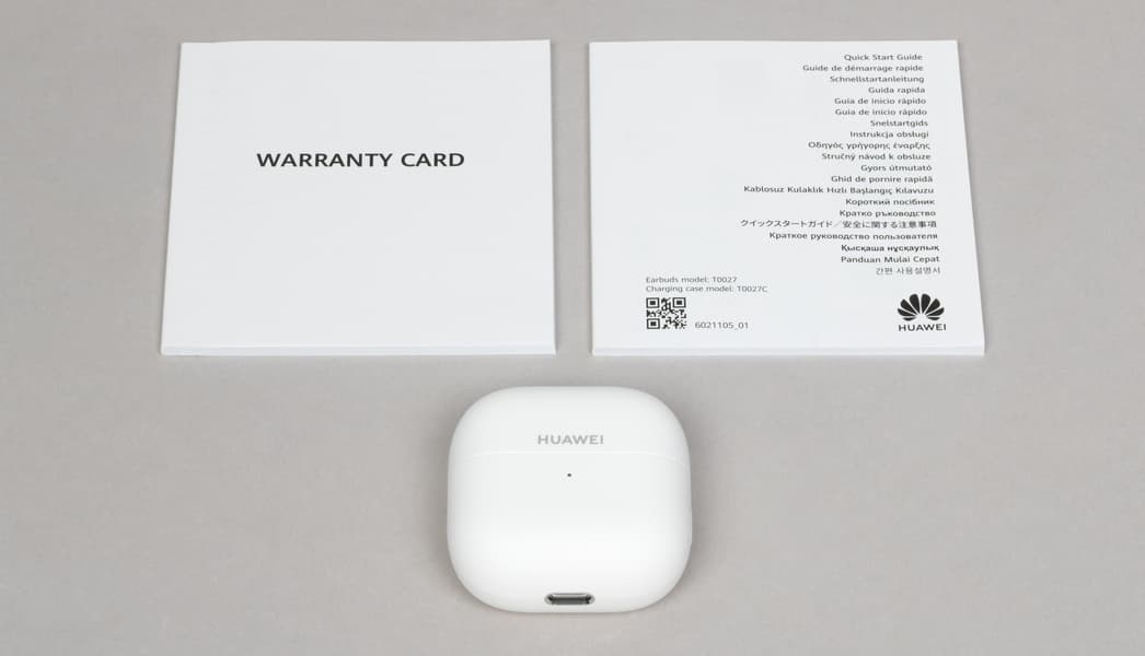 Комплект поставки предельно минималистичен: наушники в кейсе и документация — на этом всё. Зарядный кабель Huawei теперь в коробку не кладет, и мы по-прежнему скорее приветствуем это решение, чем критикуем его. Полное отсутствие кабеля выглядит честнее и логичнее, чем символический короткий шнурок «для галочки», который в лучшем случае пылится в ящике с прочим хламом «на всякий случай», а в худшем — сразу отправляется в мусор.