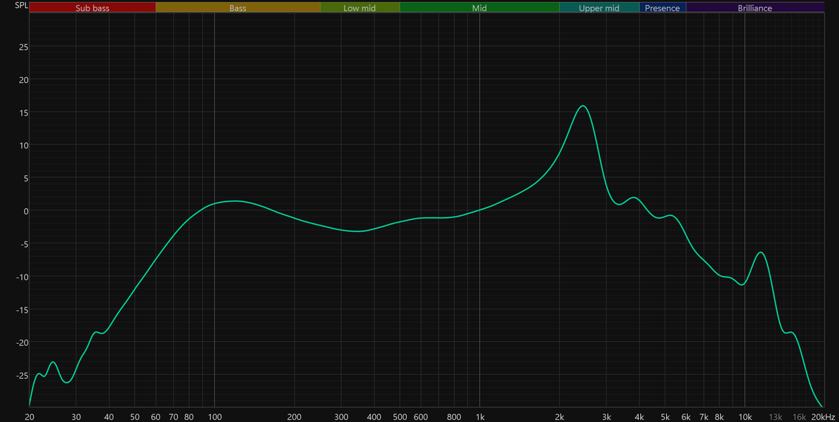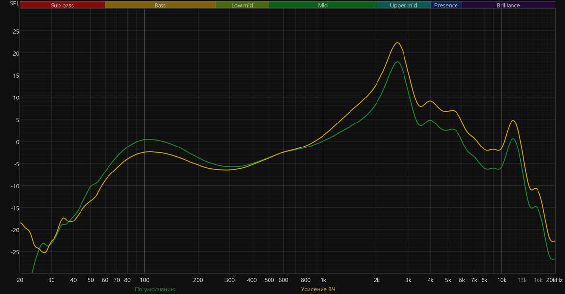 Высокие частоты читаются хорошо, но имеют характерный окрас. Пик в районе 10 кГц хоть и умеренный, но способен придать звуку дополнительную яркость и подчеркнуть детали — особенно шипящие согласные, тарелки и другие высокочастотные нюансы. В отдельных композициях это может восприниматься как избыточная резкость и приводить к повышенной утомляемости при длительном прослушивании.