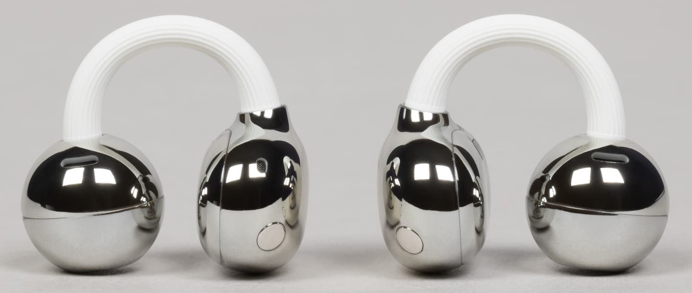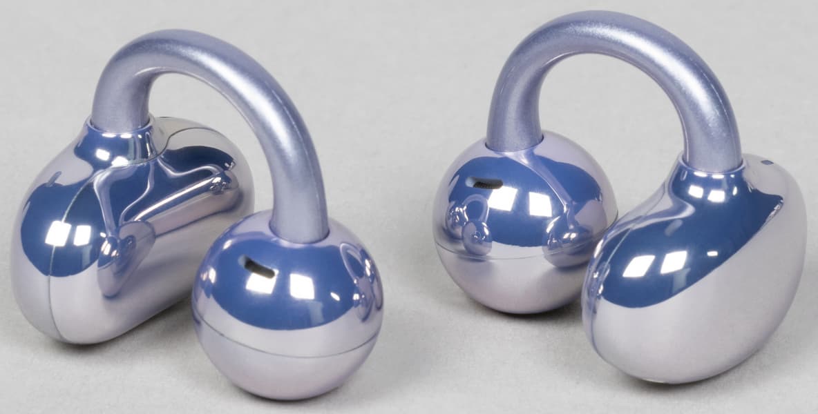Вкратце напомним, в чем суть форм-фактора. FreeClip фиксируются на ухе при помощи двух округлых модулей и специальной дуги, что и делает их внешне похожими на клипсы. При этом звуковод не проникает внутрь слухового прохода, как у внутриканальных моделей. За счет этого ухо остается открытым, пользователь продолжает слышать окружающие звуки — во время прогулок или пробежек на свежем воздухе это может быть особенно удобно, да и в повседневных сценариях такая особенность нередко оказывается полезной. При этом универсальными наушники-клипсы не назовешь: например, ездить в них в транспорте будет не слишком комфортно, но и создавались они явно не для этого. В данном случае это особенность конструкции, а не ее недостаток.