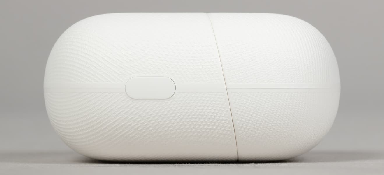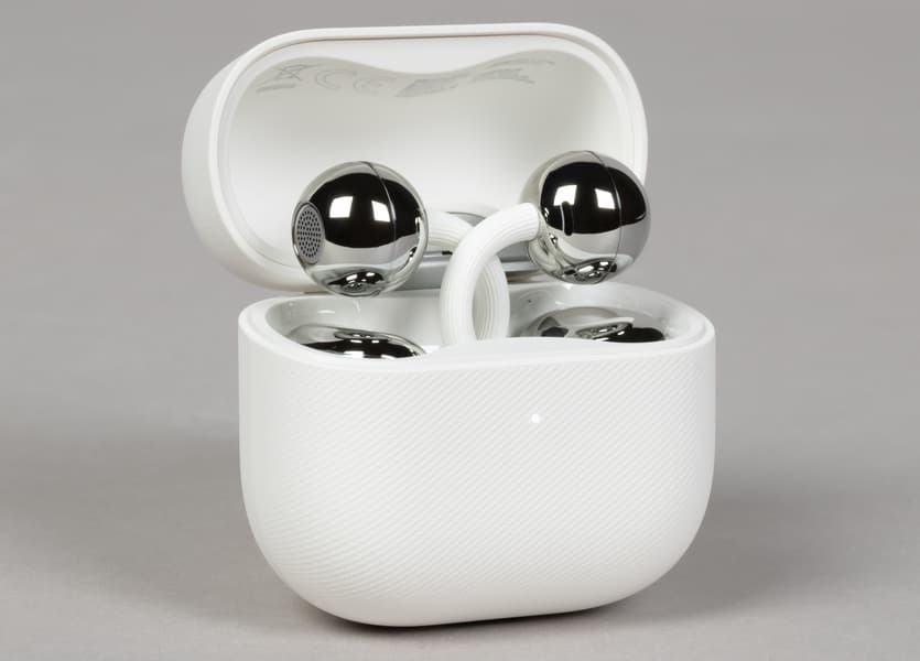 Наушники размещаются в кейсе довольно необычным образом: внешняя стенка фасолевидного элемента оказывается внутри слотов, при этом перемычки развернуты друг к другу, а округлые части смотрят в разные стороны. К правильной укладке придется немного привыкнуть, но каких-то ощутимых усилий это не требует. Сами наушники полностью одинаковы по форме — где правый, а где левый, система определяет динамически в зависимости от их положения на голове, так что пользователю следить за этим не нужно. В футляре они удерживаются надежно: фиксируются магнитами и не выпадают, даже если его перевернуть и довольно сильно потрясти.