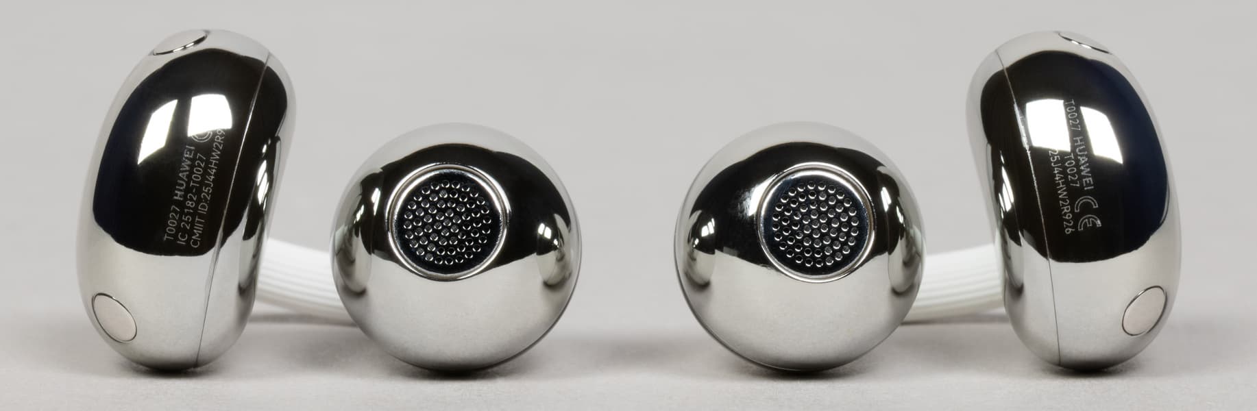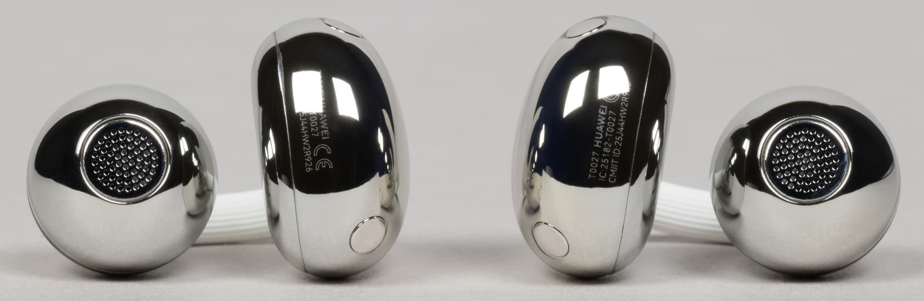 В верхней части округлых элементов видны щелевидные отверстия, закрытые изнутри сеткой. С равной вероятностью они могут использоваться для размещения микрофонов системы шумоподавления при звонках, а также выполнять компенсационную функцию — помогать сбрасывать избыточное давление при работе динамического драйвера.