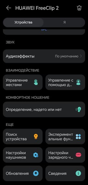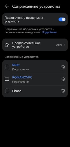 Далее расположен виджет центра подключений, который который мы регулярно и вполне заслуженно хвалим. На странице его настроек можно увидеть полный список сопряженных устройств с возможностью удалить ненужные, а также выбрать предпочтительные, если это необходимо. Мы за все годы тестирований наушников Huawei так и не смогли найти причин воспользоваться этой опцией — автоматика отлично справляется сама, оперативно переключая фокус между устройствами в нужный момент.