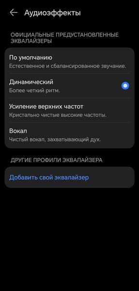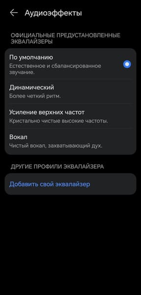 К счастью, в приложении теперь есть полноценный 10-полосный эквалайзер, так что характер звучания во многом можно подстроить под себя. Из готовых пресетов самым интересным оказался «Динамический»: он сохраняет заметный акцент на басах, но при этом ощутимо подтягивает нижнюю середину, делая ее более читаемой. В итоге звучание получается очень приятным, пусть и слегка гулковатым.