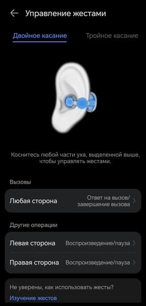 Профиль управления настраивается, но вариантов его организации не так-то и много. Однократный тап заблокирован, чтобы избежать случайных срабатываний. На двойной можно назначить переключение треков, управление воспроизведением или вызов голосового помощника.