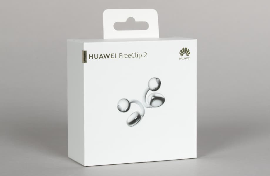 Huawei FreeClip 2 поставляется в белой коробке из картона средней плотности со съемной крышкой. Оформление характерно для производителя: название модели и логотип выполнены тиснением золотистой фольгой, по центру крышки размещено изображение устройства. Внутри кейс с наушниками фиксируется с помощью пластикового ложемента.