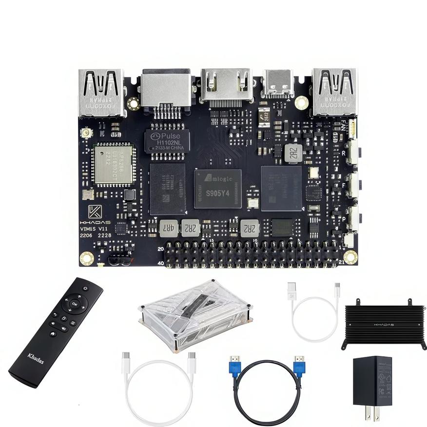 На борту Khadas VIM1S установлен процессор Amlogic S905Y4 (12нм, 4 ядра, 2 ГГц), работающий в паре с 2 гигабайтами оперативной памяти. Интересной особенностью является отсутствие встроенного накопителя — загрузка операционной системы производится с карты microSD, что упрощает эксперименты с различными дистрибутивами. Набор портов включает HDMI, два USB 2.0, Ethernet и слот microSD, а также несколько служебных разъёмов, которые пригодятся, если вы решите использовать устройство в качестве одноплатного компьютера для других проектов. Уникальной чертой Khadas VIM1S является фирменный загрузчик OOWOW, позволяющий установить более десятка предварительно настроенных сборок операционных систем буквально одним нажатием кнопки. В комплект поставки входит сама плата, радиатор, корпус, блок питания, набор кабелей и ИК-пульт, что делает этот набор отличным выбором для технически подкованных пользователей.