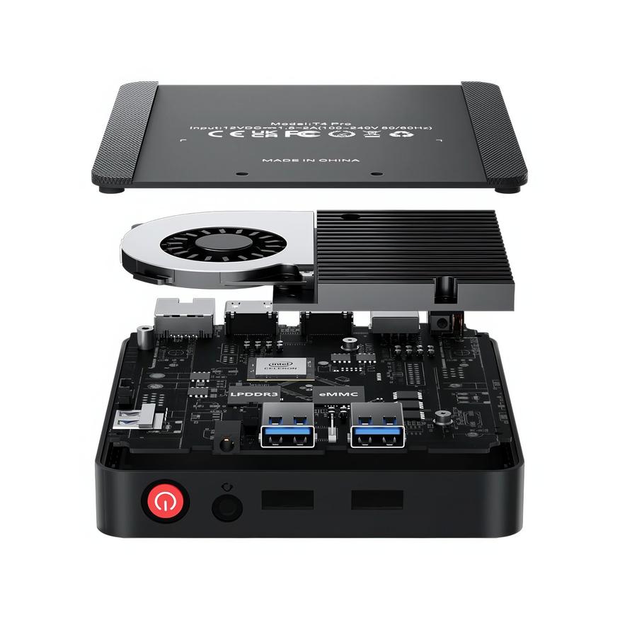 Четыре гигабайта оперативной памяти и 64 гигабайта встроенного хранилища дополняют картину, а возможность установки не только Linux, но и Windows, делает T4 Pro универсальным решением. Набор портов впечатляет: четыре USB 3.0, Ethernet, два HDMI и 3.5 мм аудиоразъём. В комплекте вы найдёте HDMI-кабель и адаптер питания, но пульт придётся докупить отдельно. Производитель гордо называет T4 Pro «самым маленьким HTPC в мире», и с этим трудно поспорить.