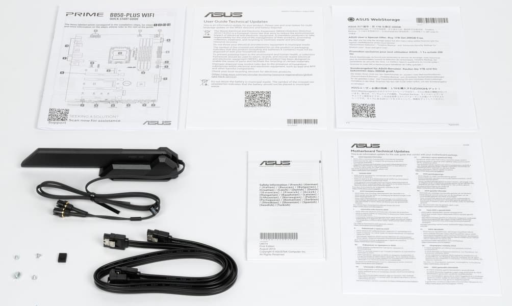 Asus Prime B850-Plus WiFi поставляется в традиционной коробке фирменного дизайна серии. Комплект размещен под платой в отдельном отсеке.