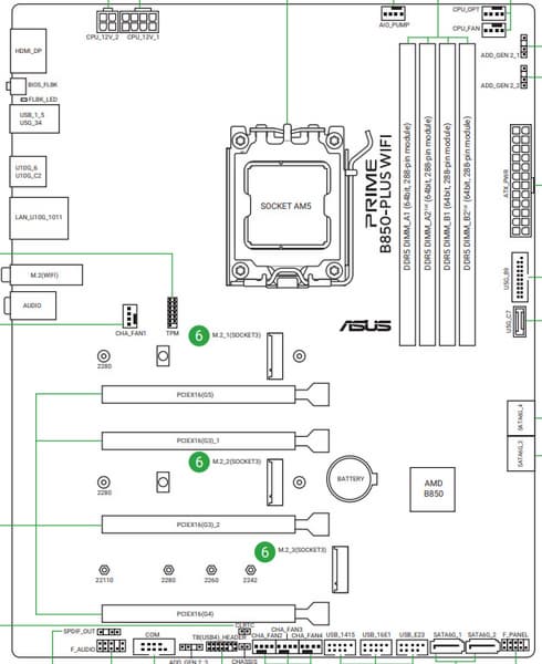 Повторим: чипсет B850 способен реализовать максимально: 6 портов USB 3.2 Gen2/1, 1 USB 3.2 Gen2x2, 6 портов USB 2.0. Процессор Ryzen 7000/8000/9000 способен реализовать до 4 портов USB 3.2 Gen2 и 1 USB 2.0.