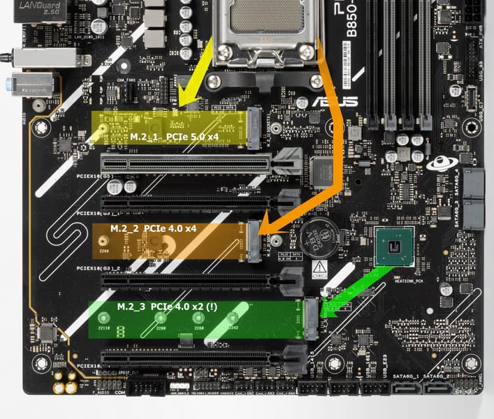 Итак, кроме USB-портов, к которым мы подойдем позже, чипсет B850 обладает 12 PCIe линиями. Считаем, сколько линий уходит на поддержку (связь) с тем или иным элементом: