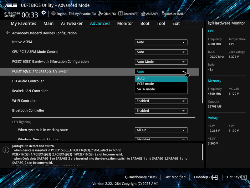 - Переключатель: или слоты PCIe x16_3/4 (2 линии PCIe 3.0); или порты SATA 1/2 (2 линии PCIe 3.0);