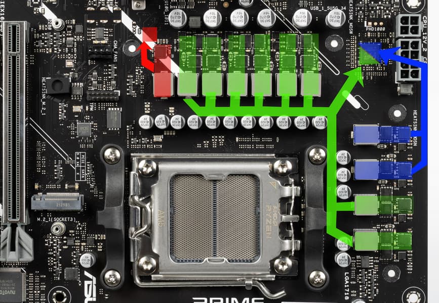 Внешне схема питания выглядит как 8+2+1: 8 фаз — ядро процессора, 2 фазы — SoC (I/O-чиплет Ryzen), 1 фаза — VDD_MISC (вывод встроенной графики).