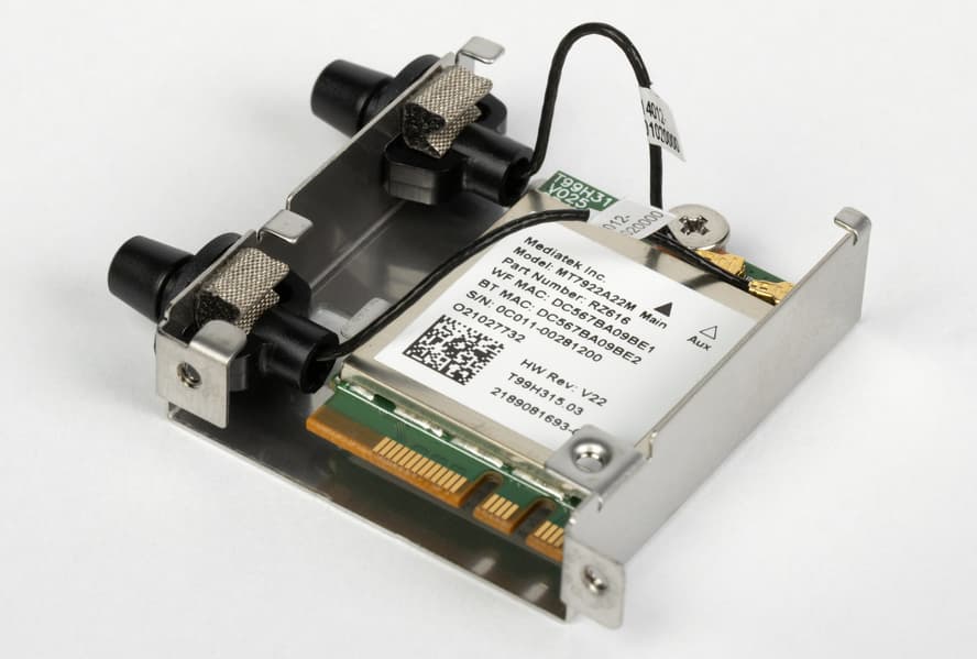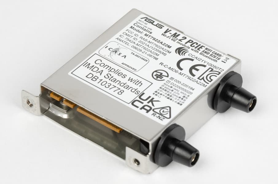 Имеется и комплексный беспроводной адаптер на контроллере MediaTek MT7922, через который реализованы Wi-Fi 6E (802.11a/b/g/n/ac/ax) и Bluetooth 5.3. Он установлен в слот M.2 (E-key), и его разъемы для привинчивания выносных антенн выведены на заднюю панель.