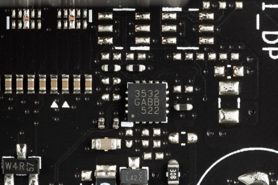 На оборотной стороне расположен один ШИМ-контроллер и немного мелкой логики. Текстолит обработан хорошо: во всех точках пайки острые концы срезаны, а также отшлифовано. Защитной пластины (бэкплейта) нет.