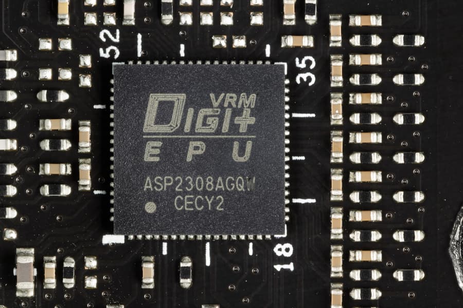 Управляет наборами фаз VCore и SoC (8+2) фирменный ШИМ-контроллер Digi+ ASP2308.