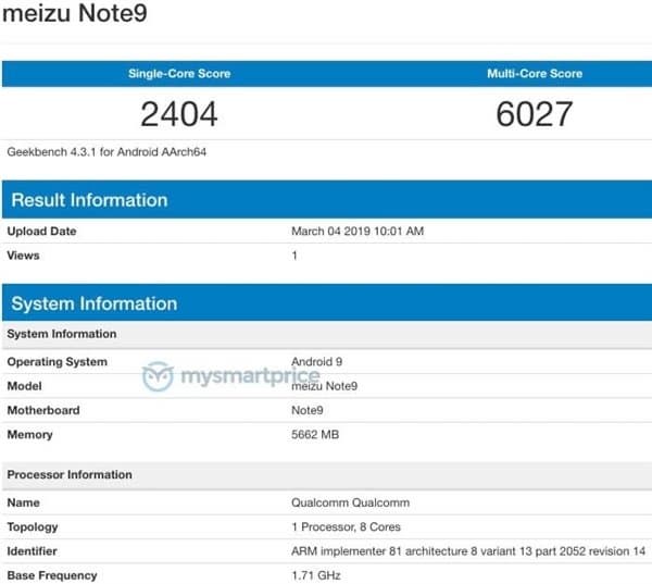 Meizu официально представит смартфон Note 9, во многом повторяющий конфигурацию модели Redmi Note 7 Pro, 6 марта. Но уже сейчас аппарат засветился в бенчмарке Geekbench.