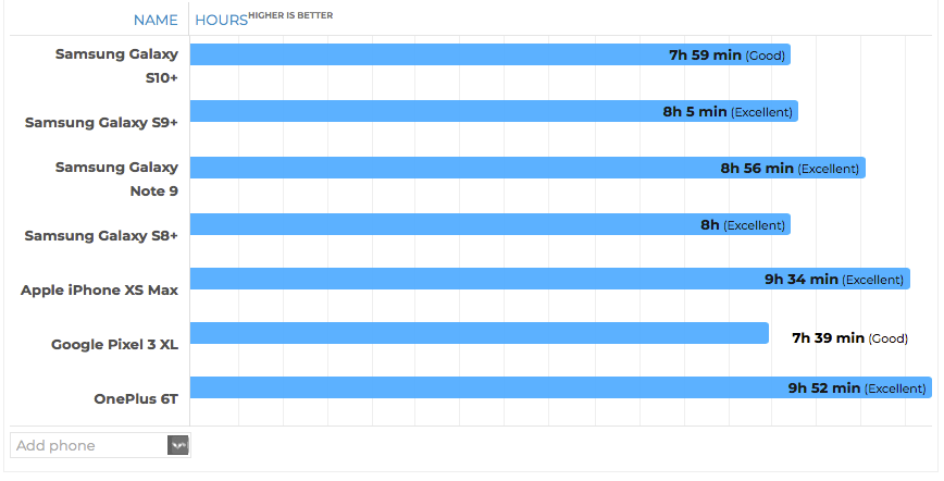 Как оказалось, 4100 мА·ч не так уж и помогли. Смартфон смог проработать 7 часов 59 минут. Это хороший результат, но не фантастический. Особенно, если учесть, что конкурирующие iPhone XS Max и OnePlus 6T, а также прошлогодние Samsung Galaxy S9+ и Galaxy Note9 показали результаты лучше. Что уж говорить, даже Samsung Galaxy S8+ двухлетней давности обогнал Galaxy S10+, хоть и всего на одну минуту. Результат хуже показал Google Pixel 3 XL.