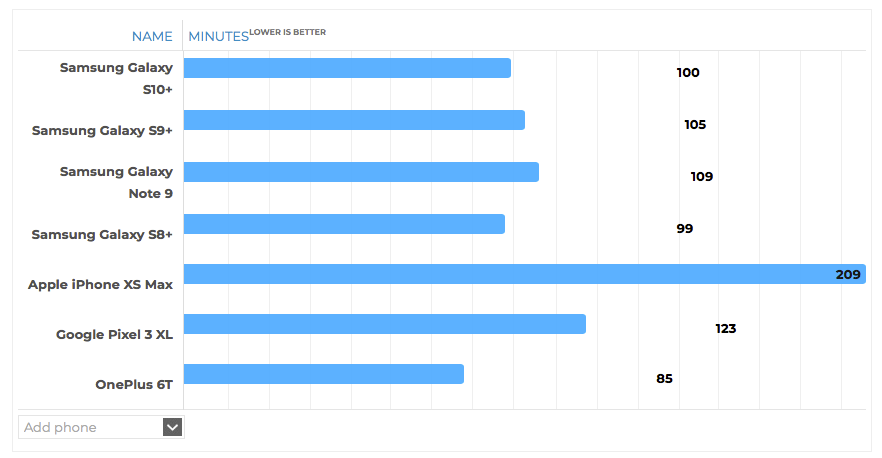 Что касается скорости зарядки с 0 до 100%, то здесь Samsung Galaxy S10+ проявил себя значительно лучше. Он заряжается за 100 минут. Обогнали его лишь OnePlus 6T и Samsung Galaxy S8+. Чтобы полностью зарядить с нуля iPhone XS Max надо вообще потратить 205 минут, а это почти 3,5 часа. Для тестов использовалось фирменное зарядное устройство из комплекта поставки.