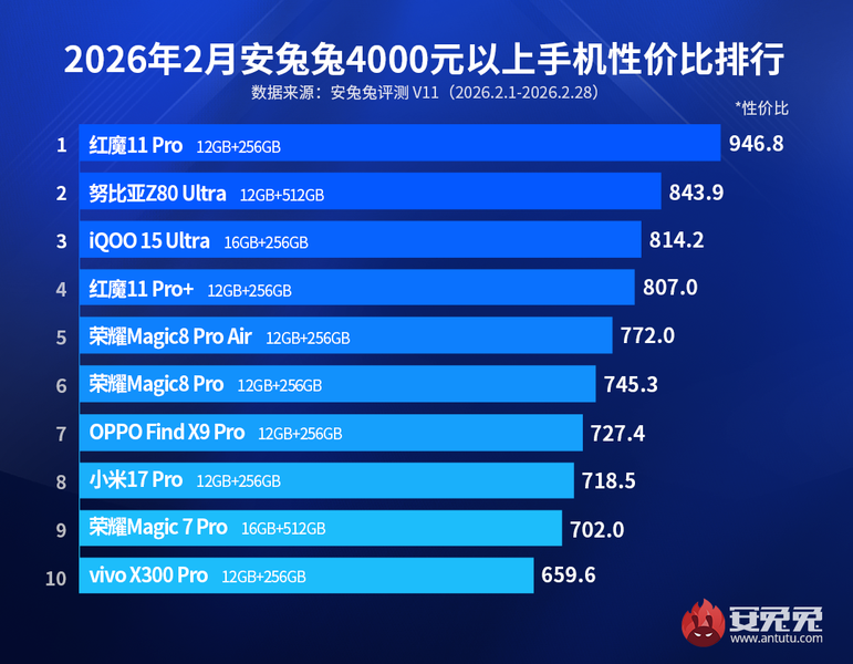 Разработчики AnTuTu опубликовали топ-10 самых выгодных флагманских смартфонов по соотношению цены и производительности в феврале 2026 года — аппаратов в ценовой категории более 4000 юаней (более 580 долларов). Первое место занял Red Magic 11 Pro. На втором и третьем местах — Nubia Z80 Ultra и iQOO 15 Ultra.