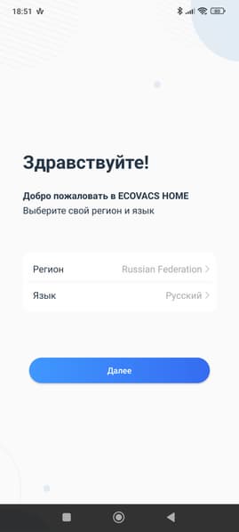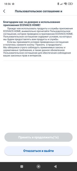 Мобильное приложение Ecovacs Home без каких-либо сложностей загрузилось из Google Play и установилось без проблем. Как водится, в начале нам предстоит завести аккаунт (если его еще нет), принять пользовательское соглашение и ввести название для своего дома.