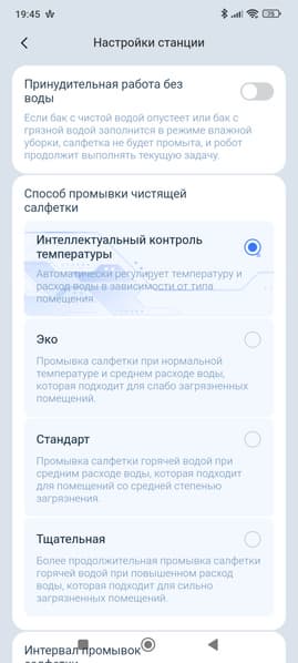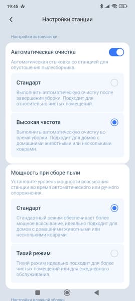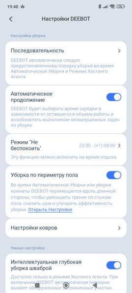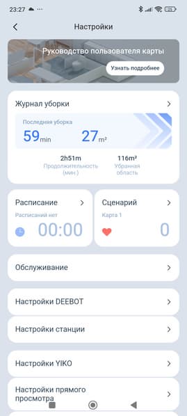 Ну а перейдя в раздел настроек, мы увидим множество всевозможных пунктов меню и настроек, позволяющих гибко настроить буквально каждый нюанс, касающийся уборки, выбора режима работы базы или самого пылесоса и т. д. и т. п.
