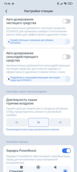 Наличие быстрой зарядки (Powerboost charge) позволит роботу заряжаться в самом деле быстро. В особенности впечатляет это прямо во время уборки: робот запарковался для мытья роликовой насадки и дозаправки водой — и буквально за пару минут успел восстановить несколько процентов заряда (до 4-5% за один цикл мойки). Порой даже встречаются такие ситуации, когда по завершении уборки уровень заряда робота окажется выше, чем был изначально!