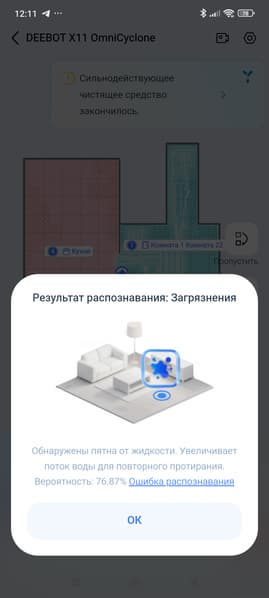 В ходе уборки робот сообщит о распознанных загрязнениях и препятствиях, а по завершении — покажет статистику.