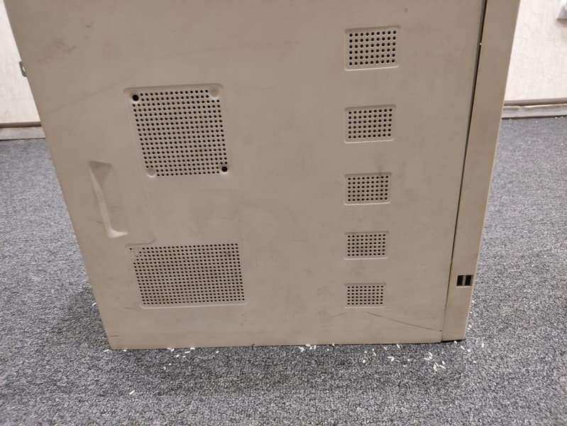 С тыльной стороны находится разъем для подключения кабеля питания, а также отсек для намотки его излишков. Слева — решетка выхода воздуховода. В верхней части — наклейка с технической информацией о модели.