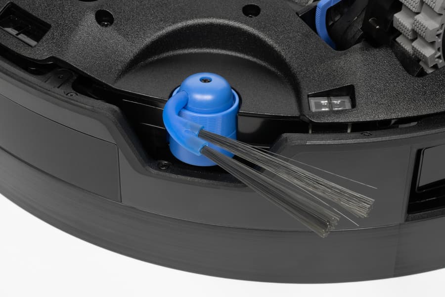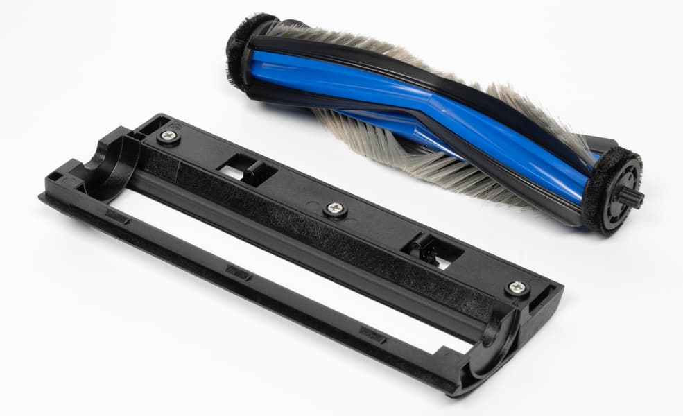 У центральной щетки имеются привычные ряды щетины и резиновые ламели. Форма не совсем привычная: она не спиралевидная, а, скорее, V-образная. На официальном сайте про это сказано буквально следующее: «Золотая спиральная конструкция позволяет боковой щетке эффективно противостоять наматыванию волос, повышая эффективность очистки. На основной щетке тройная V-структура и спиральный гребень активно отталкивают и распутывают волосы, обеспечивая непрерывную уборку и минимальное обслуживание».