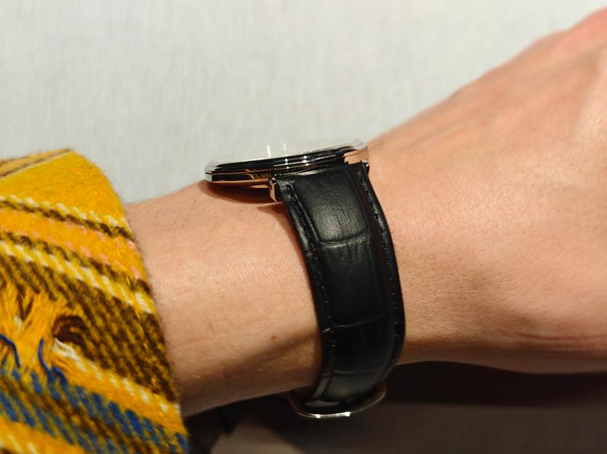 Сам узор здесь «расходится» от меньшего к большему, и это хорошее решение для костюмного размера. Часы ощущаются визуально чуть крупнее. На запястье они видны и заметны.