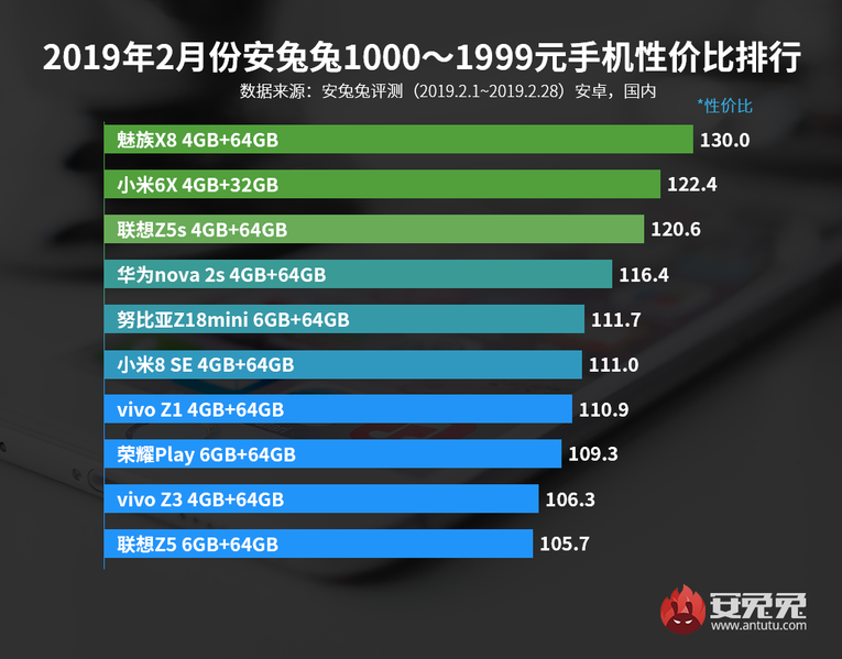 Первый рейтинг для смартфонов до 150 долларов возглавил Redmi Note 7 с 3 ГБ оперативной и 32 ГБ флэш-памяти. Его коэффициент VFM (value for money) составил 143,6, а средний балл в AnTuTu равен 143466 баллов. На втором месте оказался Lenovo K5 Pro, который стоит 140 долларов, третье досталось Meizu Note 8 стоимостью около 135 долларов.