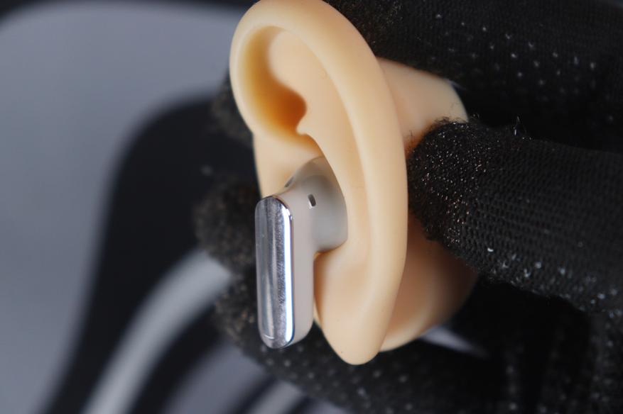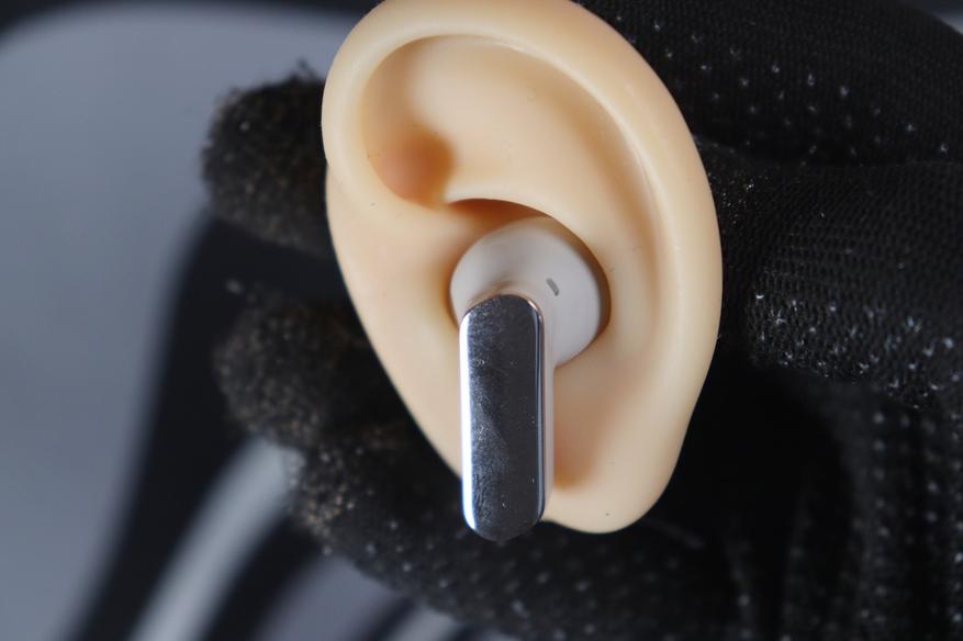 Посадка весьма уверенная: нозл направлен в слуховой канал без лишнего давления, ножка расположена параллельно козелку. Такой угол критически важен — он позволяет нажимать на тачпад без болезненного смещения наушника вглубь уха. Форма корпуса анатомически продумана: ушная часть слегка вытянута и повторяет изгиб раковины. Три размера амбушюр перекрывают большинство типов ушей, а функция проверки прилегания в приложении помогает подобрать нужный размер точнее — это влияет и на пассивную изоляцию, и на качество работы ANC.