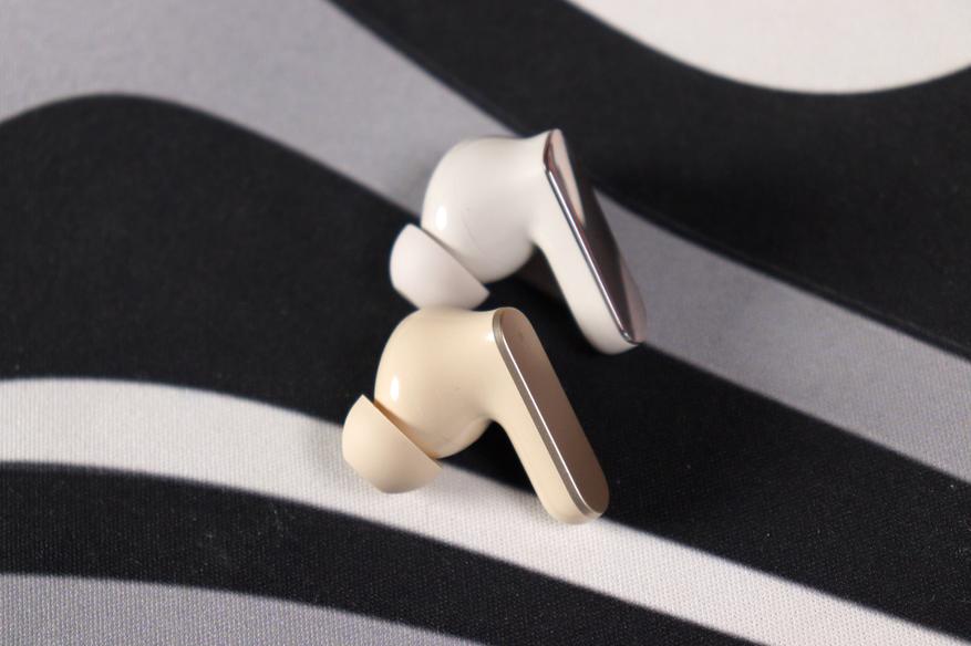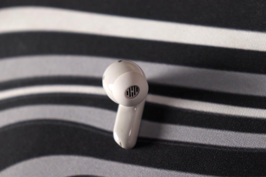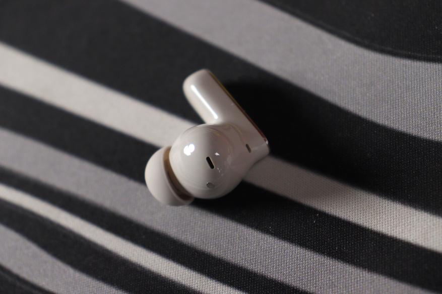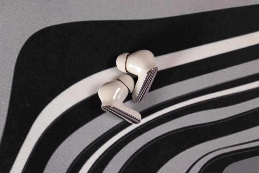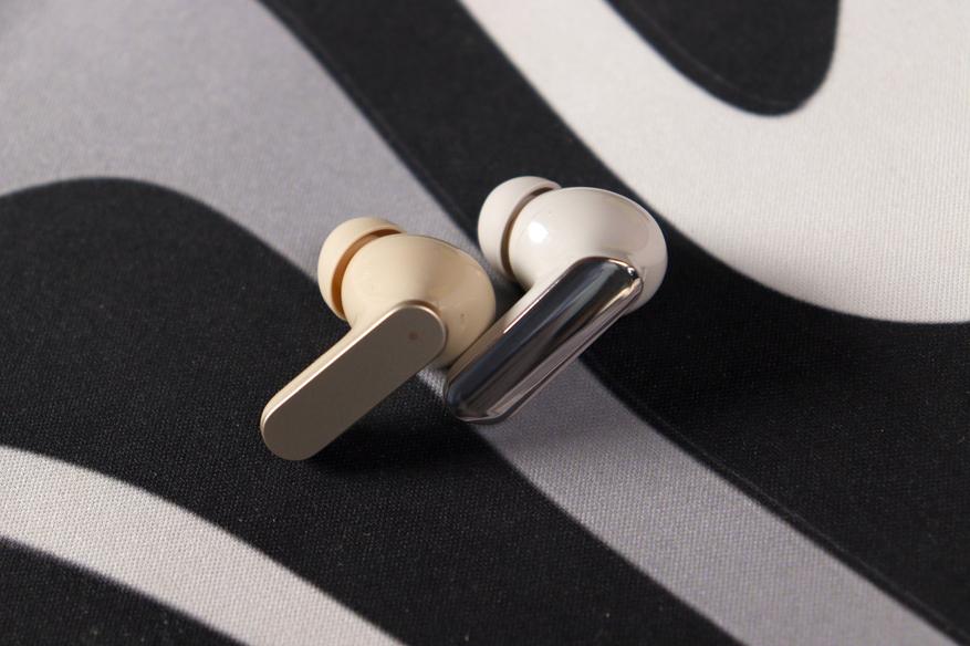 Форм-фактор — стик с коротким изогнутым нозлом. Ножка уплощённая, с зеркальным покрытием торца — именно на ней расположен сенсорный тачпад. На корпусе виден дополнительный сетчатый фильтр на нозле, компенсационное вентиляционное отверстие и два микрофонных порта — всё указывает на гибридную схему ANC. Небольшой круглый датчик на корпусе — оптический сенсор приближения для автопаузы при снятии наушника.