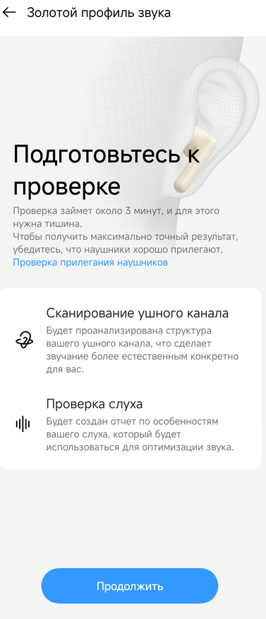 «Золотой профиль звука» — функция, которая реально меняет картину. Трёхминутная процедура сканирования ушного канала и проверки слуха формирует персональную коррекцию АЧХ. После калибровки звук становится чуть более сбалансированным конкретно под ваше восприятие — субъективно это ощущается как-то, что наушники «встали» на место.