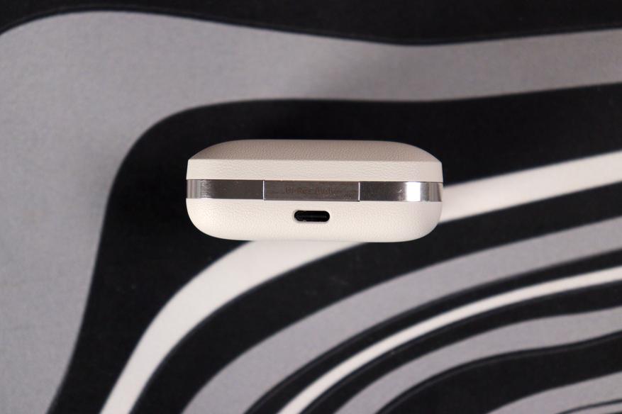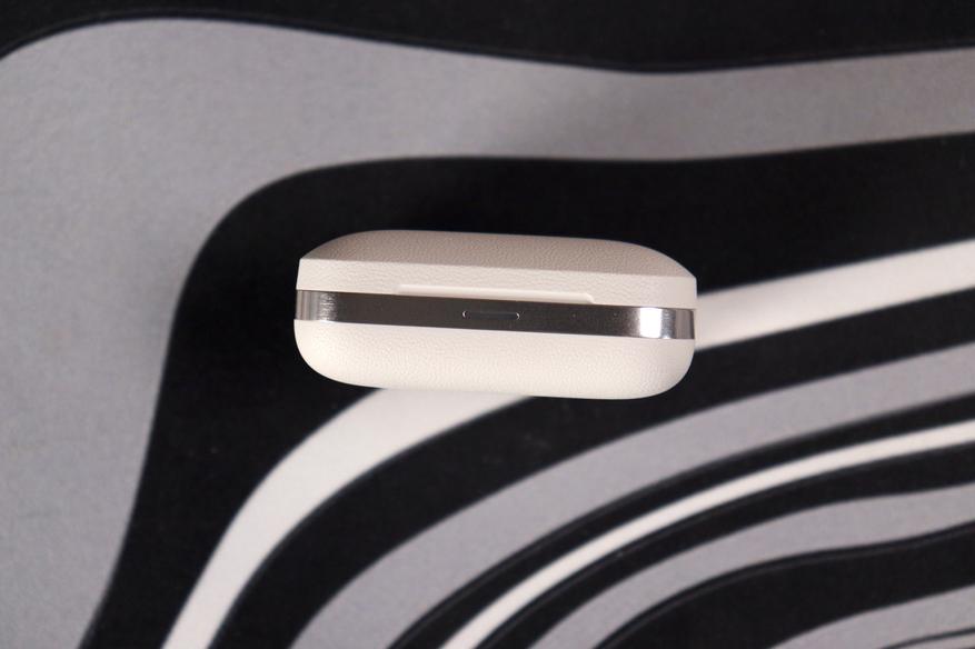 Кейс квадратный, с сильно скруглёнными углами — напоминает маленькую пудреницу из приличного отеля. Крышка покрыта материалом под искусственную кожу с мелкой зернистой текстурой: приятно на ощупь, не скользит в руке. (цветовые вариации разнятся по материалам, в других вариантах используется металл, но пластиковая версия под кожу остается наиболее удачным выбором из-за маркости, легкости и приятного на ощупь материала) Главный дизайнерский приём — металлическая окантовка по периметру с зеркальной полировкой. Она делает кейс визуально дороже, но именно она первой соберёт царапины. Порт USB-C расположен по центру нижнего торца — аккуратно, без смещений. На боковом торце — кнопка сопряжения и пара светодиодных индикаторов. Доступны как минимум две расцветки: бежево-серый и золотистый вариант, второй выглядит наряднее, но следы от рук на нём заметнее.