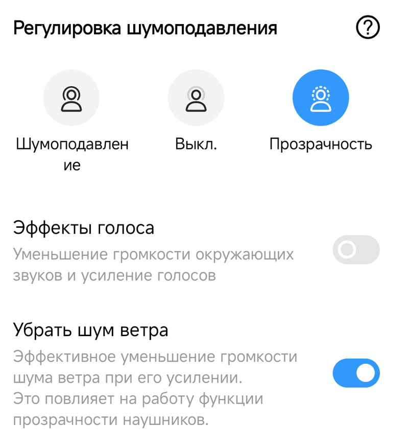 Режим прозрачности — функциональный, но не безупречный. Окружающий звук передаётся с лёгким синтетическим привкусом: чуть-чуть «компрессорный» характер при резких звуках, небольшая задержка в сравнении с реальной акустикой. Для большинства задач — выйти на кассу, услышать объявление в аэропорту, пообщаться с коллегой — этого вполне достаточно. Опция «Эффекты голоса» в режиме прозрачности дополнительно акцентирует речь и приглушает фоновый шум — полезно именно для разговоров, не для общего мониторинга среды.