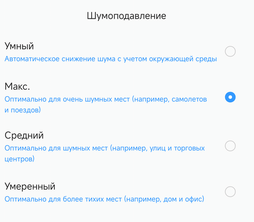 ANC работает хорошо — это честная оценка без скидок на цену. Большинство низкочастотных шумов уходит: гул кондиционеров, шум двигателей в транспорте, монотонный офисный фон — всё это система давит уверенно. Четыре режима интенсивности дают реальную гибкость: «Умеренный» оставляет небольшой фоновый контекст и меньше садит батарею, «Максимальный» ориентирован на самолёт или метро — там разница ощутима. «Умный» режим адаптируется к окружению автоматически, и работает предсказуемо: не пытается давить тишину там, где её нет, и наоборот.