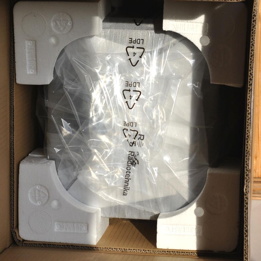 Коммерческая упаковка оформлена в духе бренда (внутри пенопластовые вставки):