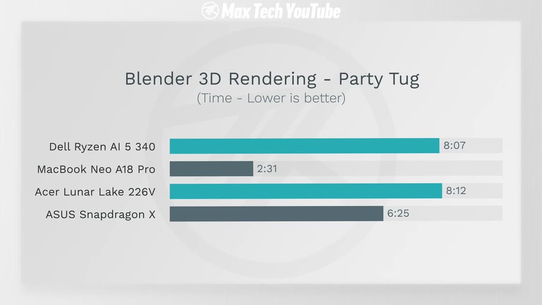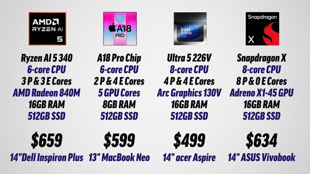 На что способен 600-долларовый MacBook Neo по сравнению с MacBook Air M1 мы уже видели. Теперь тот же блогер Max Tech решил сравнить новинку Apple с тремя Windows-ноубуками в этой же ценовой категории, причём взял три модели на совершенно разных платформах.