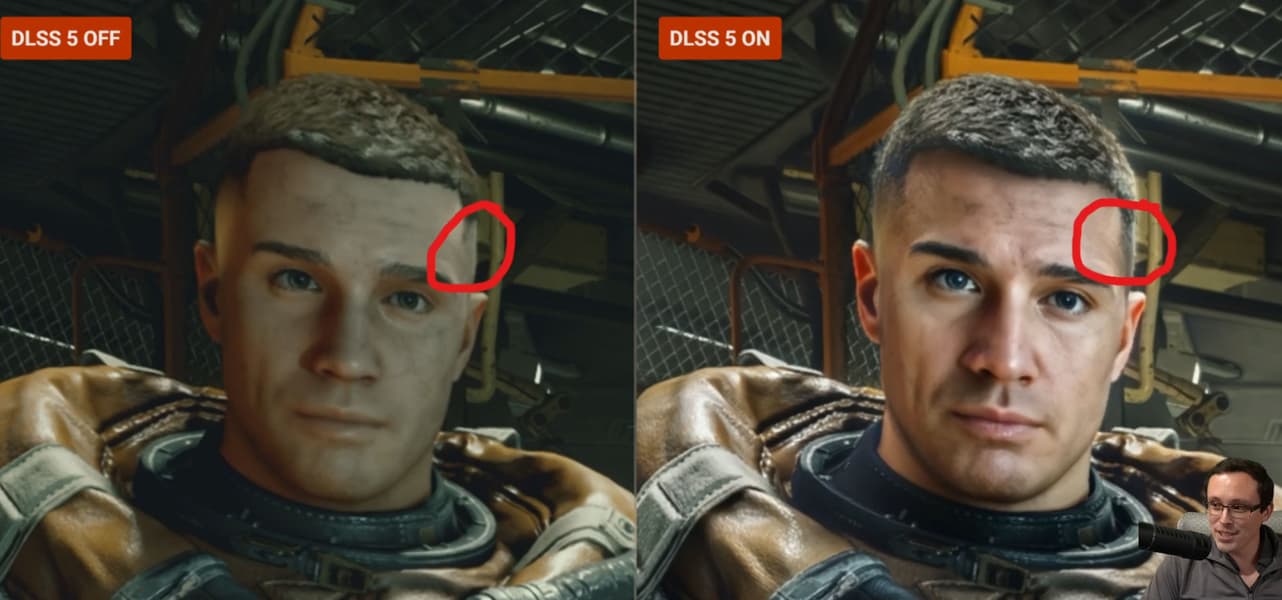Собственно, скриншот выше отлично демонстрирует, какие последствия могут быть из-за этого. Как можно видеть, DLSS 5 дорисовала волосы, где их вообще не было, а также увеличила нос, приняв его тень за сам нос.