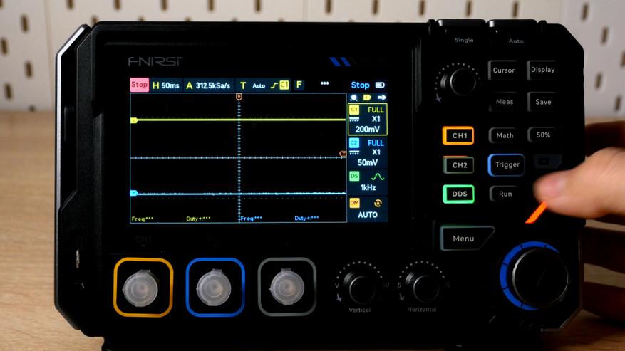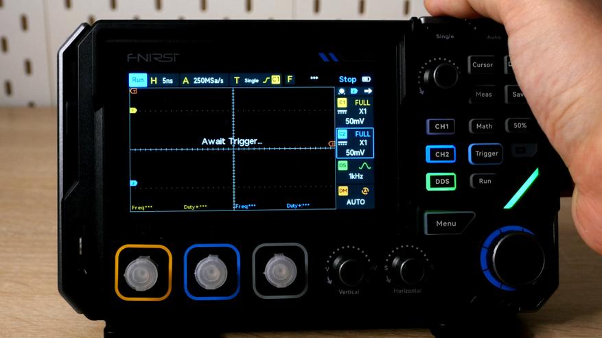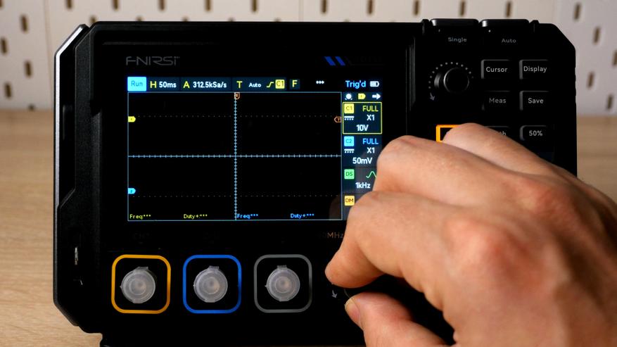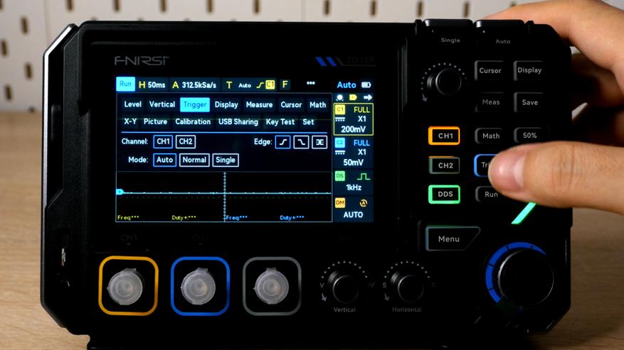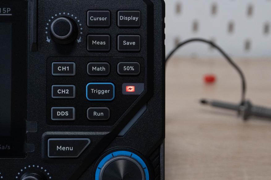 Но физическими кнопками можно быстро попасть в нужный раздел, хотя переключать параметры всё же придется пальцами. С одной стороны не очень удобно, но меню полупрозрачно и в ходе настроек энкодерами можно продолжать управлять графиком. Занятное решение вывести отдельно две клавиши в верхней части для активации ручного триггера и автонастройки.