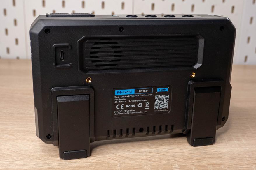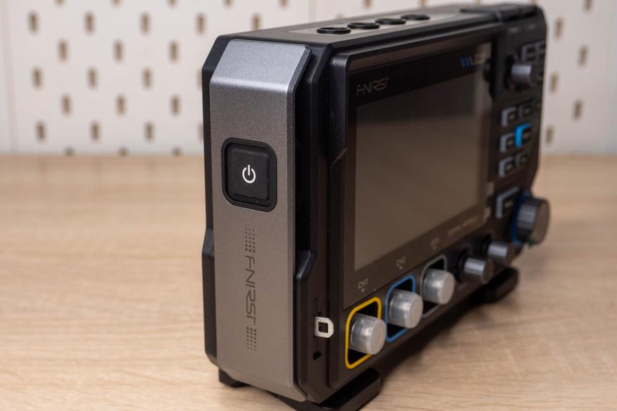 Корпус не маленький. Судя по звуку и тактильным ощущениям, серебристые элементы металлические(но это не точно). На лицевой стороне имеется контакт 1кГц для калибровки, два разъема под независимые каналы и выход генератора сигналов. В качестве элементов управления используется четыре энкодера и пятнадцать кнопок, включая две «педальки» в верхней части и кнопку выключения на левой грани. На верхней грани разместили четыре стандартных разъема мультиметра. Сзади находится разъем Type-C, перфорации в нижней части и за вентилятором активного охлаждения, а так же две резьбы для фиксации на подвижном манипуляторе.